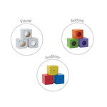 • 3 visuele, 3 auditieve en 3 tastbare blokken nodigen kinderen uit om hun zintuigen te verkennen
