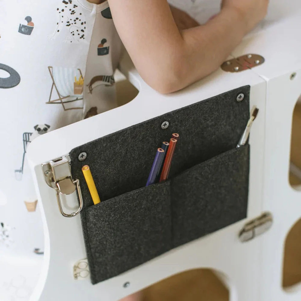 Geef je STEP'n'SIT® helper tower nog meer functionaliteit met de handmade pocket van vilt. Dit slimme accessoire is ideaal om kleine spulletjes zoals kleurpotloden, speelgoed of keukengerei netjes en binnen handbereik te houden terwijl je kindje speelt of helpt in de keuken.
