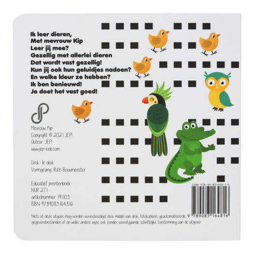Boek hard karton met afgeronde hoeken. Ik leer woordjes met mevrouw Kip. Leer jij mee? Gezellig met allerlei dieren. Dat wordt gezellig! Ken jij ook hun geluidjes? En welke kleur ze hebben? Ik ben benieuwd! Je doet het vast goed!