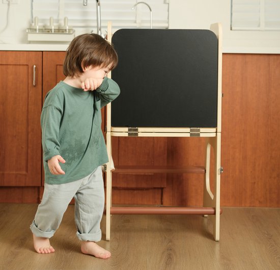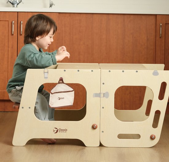 Classic World houten leertoren en tafel - verstelbaar - educatief speelgoed 90cm. Met deze houten leertoren en tafel van Classic World wordt leren en spelen één groot avontuur! De leertoren is verstelbaar, zodat hij met je kind meegroeit en altijd de perfecte hoogte heeft. Het krijtbord maakt het extra leuk om creatief bezig te zijn, terwijl de stevige houten constructie zorgt voor jarenlang speelplezier. Of je nu samen een spelletje speelt, tekent of leert tellen, deze 2-in-1 leertoren en tafel biedt eindeloze mogelijkheden. Dankzij het tijdloze design past hij in elke kamer en stimuleert hij de zelfstandigheid en creativiteit van je kind. Ontdek hoe leuk leren kan zijn! Extra informatie. Verstelbare leertoren en tafel in één. Inclusief krijtbord voor extra speelplezier. Gemaakt van stevig en duurzaam hout Geschikt voor kinderen vanaf 3 jaar.