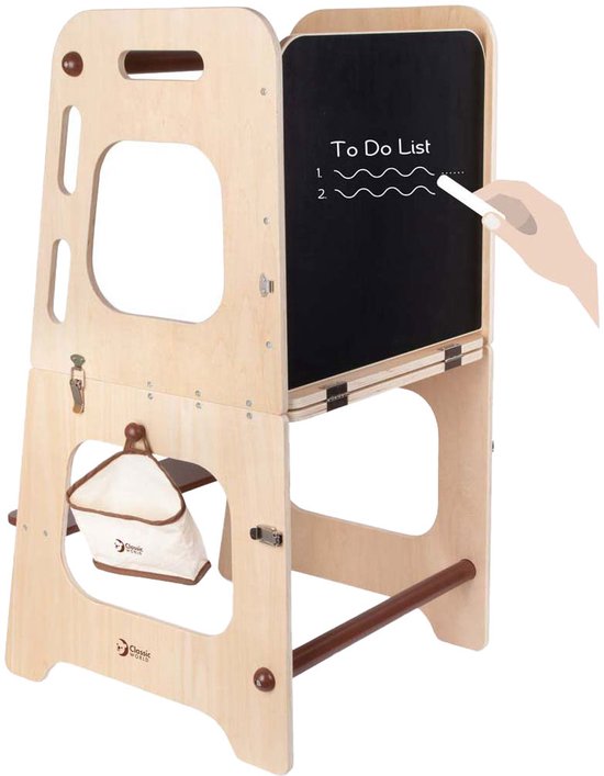 Eenheid prijs / PerClassic World houten leertoren en tafel - verstelbaar - educatief speelgoed 90cm. Met deze houten leertoren en tafel van Classic World wordt leren en spelen één groot avontuur! De leertoren is verstelbaar, zodat hij met je kind meegroeit en altijd de perfecte hoogte heeft. Het krijtbord maakt het extra leuk om creatief bezig te zijn, terwijl de stevige houten constructie zorgt voor jarenlang speelplezier. Of je nu samen een spelletje speelt, tekent of leert tellen, deze 2-in-1 leertoren en tafel biedt eindeloze mogelijkheden. Dankzij het tijdloze design past hij in elke kamer en stimuleert hij de zelfstandigheid en creativiteit van je kind. Ontdek hoe leuk leren kan zijn! Extra informatie. Verstelbare leertoren en tafel in één. Inclusief krijtbord voor extra speelplezier. Gemaakt van stevig en duurzaam hout Geschikt voor kinderen vanaf 3 jaar.
