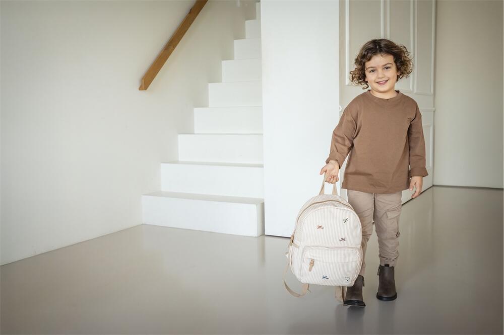 Deze leuke beige rugzak uit de Nostalgia-collectie is perfect voor elk avontuur en een echte must-have voor je kindje. De tas is gemaakt van gerecycled polyester en vrolijk versierd met een all-over strepenprint met vliegtuigjes. Het ruime hoofdvak met dubbele rits biedt voldoende ruimte voor een broodtrommel, drinkfles, een extra setje kleding en beschikt over een praktisch voorvak met rits voor kleine spulletjes. Ideaal voor naar school of een dagje uit! De rugzak kan gedragen worden aan de stevige lus aan de bovenzijde of comfortabel op de rug met de verstelbare schouderbanden. Dankzij de handige gespen op de schouderbanden blijft de tas altijd stevig en prettig zitten. Binnenin is de rugzak voorzien van een naamlabel en een houder voor een drinkfles, zodat alles netjes op zijn plek blijft. Een vrolijke en praktische rugzak waar je kindje veel plezier van zal hebben!